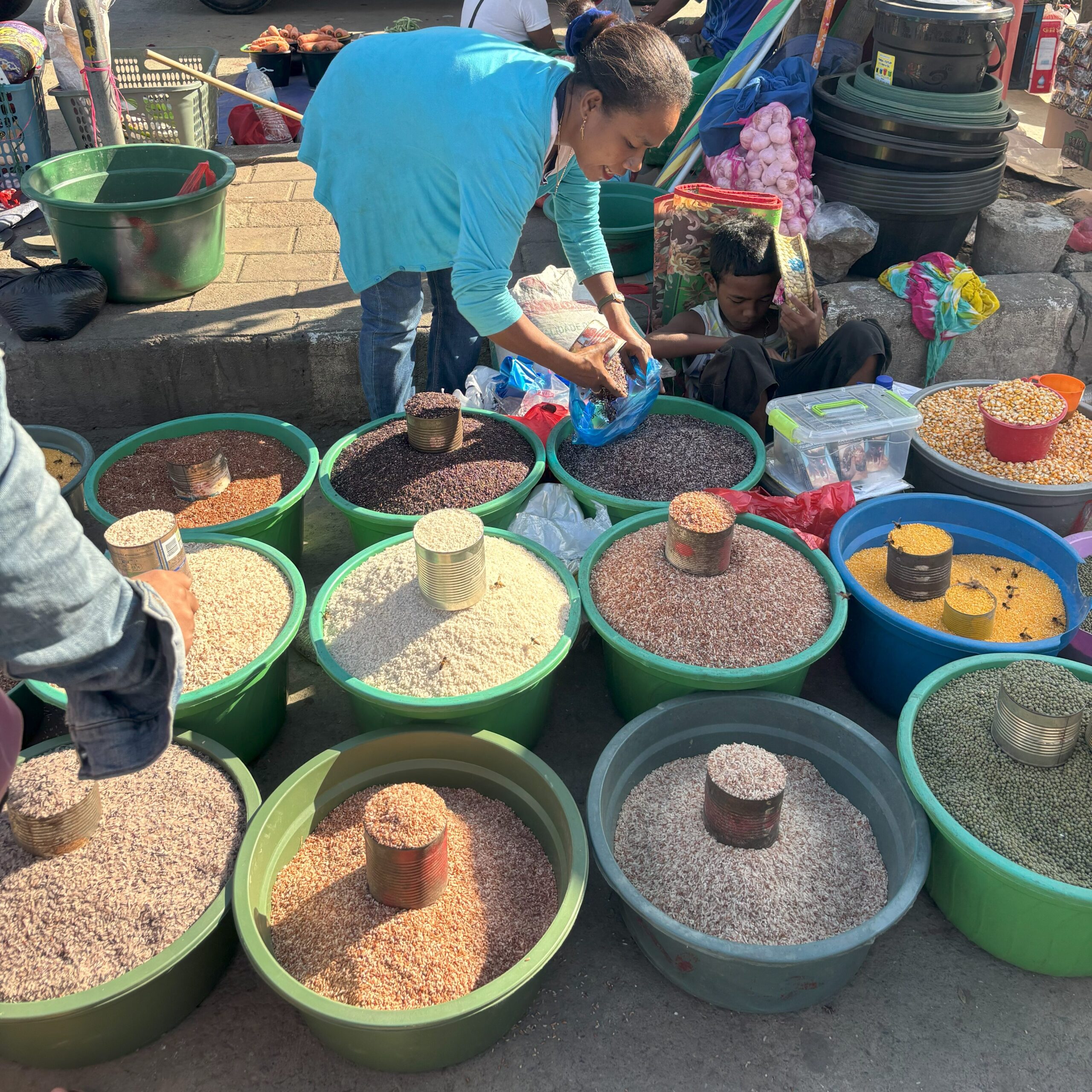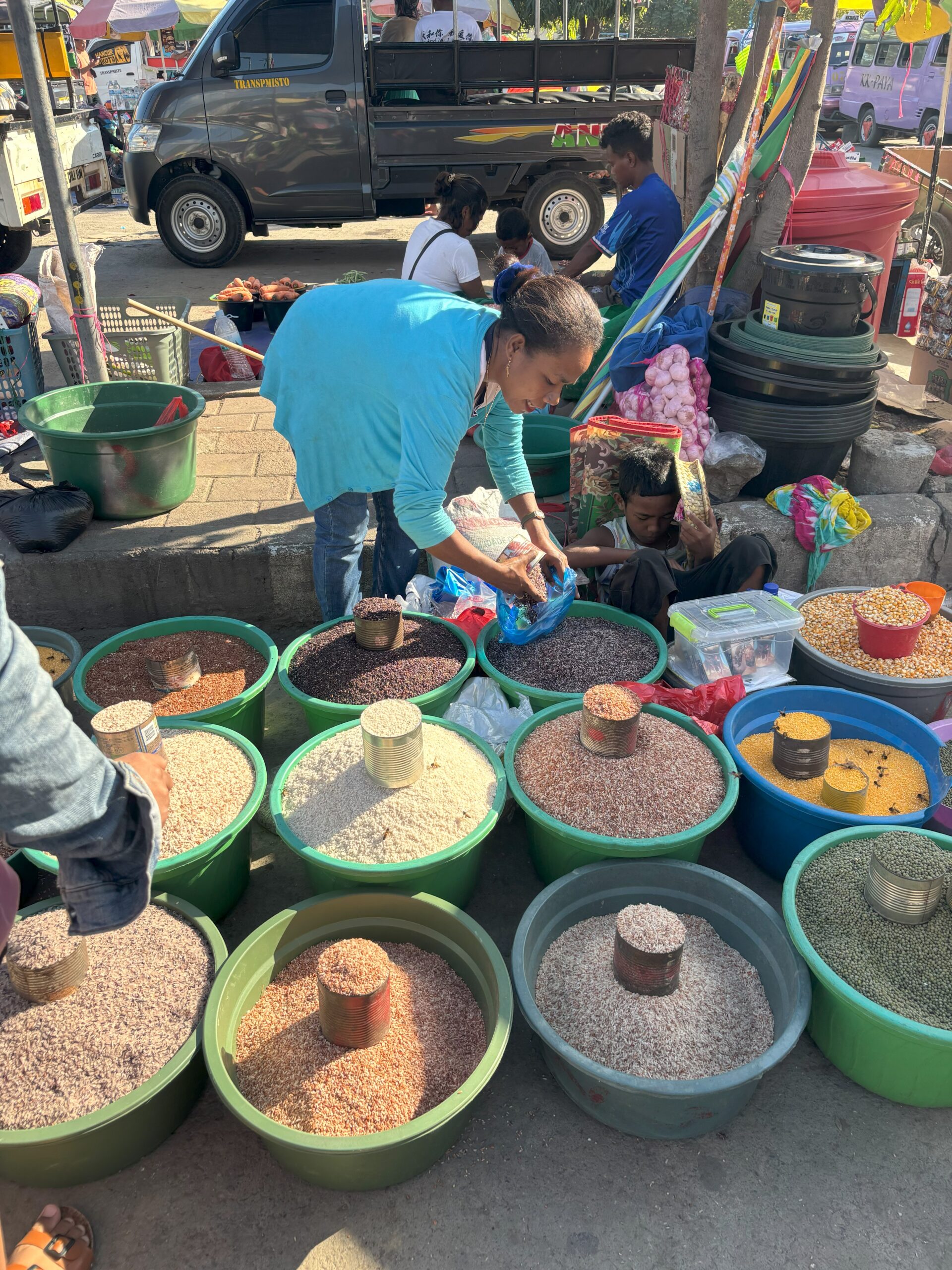 首都・ディリ最大の市場「メルカド・タイベシ」に行けば、現地に暮らす人びとの生活必需品が揃います。その一角では、東ティモールの人びとの主食である米(白米、黒米、赤米)をはじめ、豆類(大豆、落花生、金時豆、緑豆、あずき、キマメ)やトウモロコシといった穀物が陳列され、粉ミルクの空き缶に一掬い250g単位で量り売りされています。