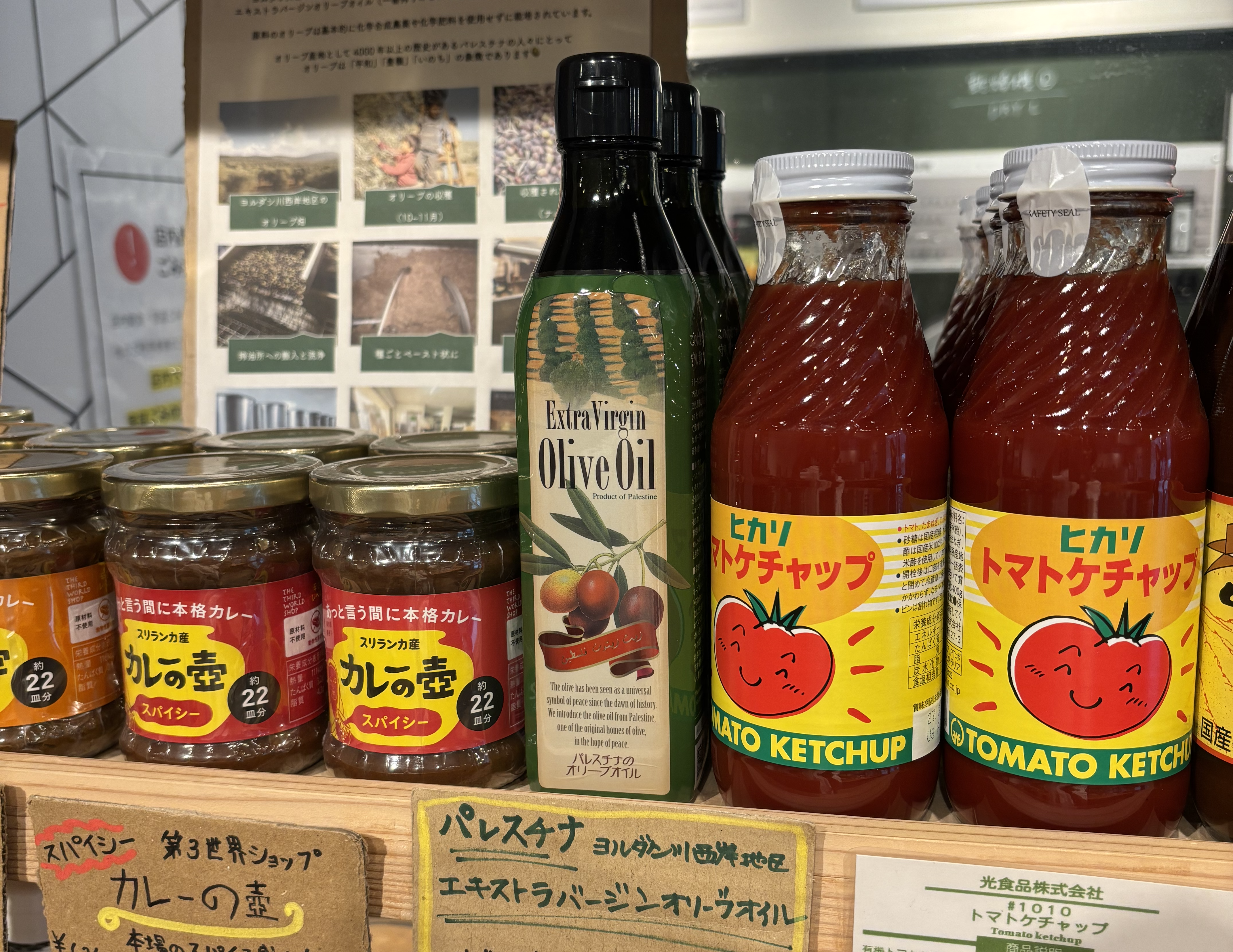 オリーブオイルは、以前からパレスチナに関心があり、2023年10月以降、パレスチナの情勢の悪化を機に取り扱いを開始。農業をしている岡田さんは、同じ生産者として思いを寄せずにはいられなかったそうです。規格外バランゴンバナナは、小分けではなくバナナがダンボール箱にどっさり入っているというのが量り売りと相性がよかったことから取り扱いはじめ、現在は月2回の定期的な販売となりました。毎週販売してほしいという声が寄せられるほどの「スター商品」に。オリーブオイルもバナナも馴染みがある食べ物ですが、背景を知っている方は少ないので、「野の」での買い物が生産地の状況を知るきっかけとなったら嬉しいし、商品のストーリーを伝えられたらと思っているということでした。