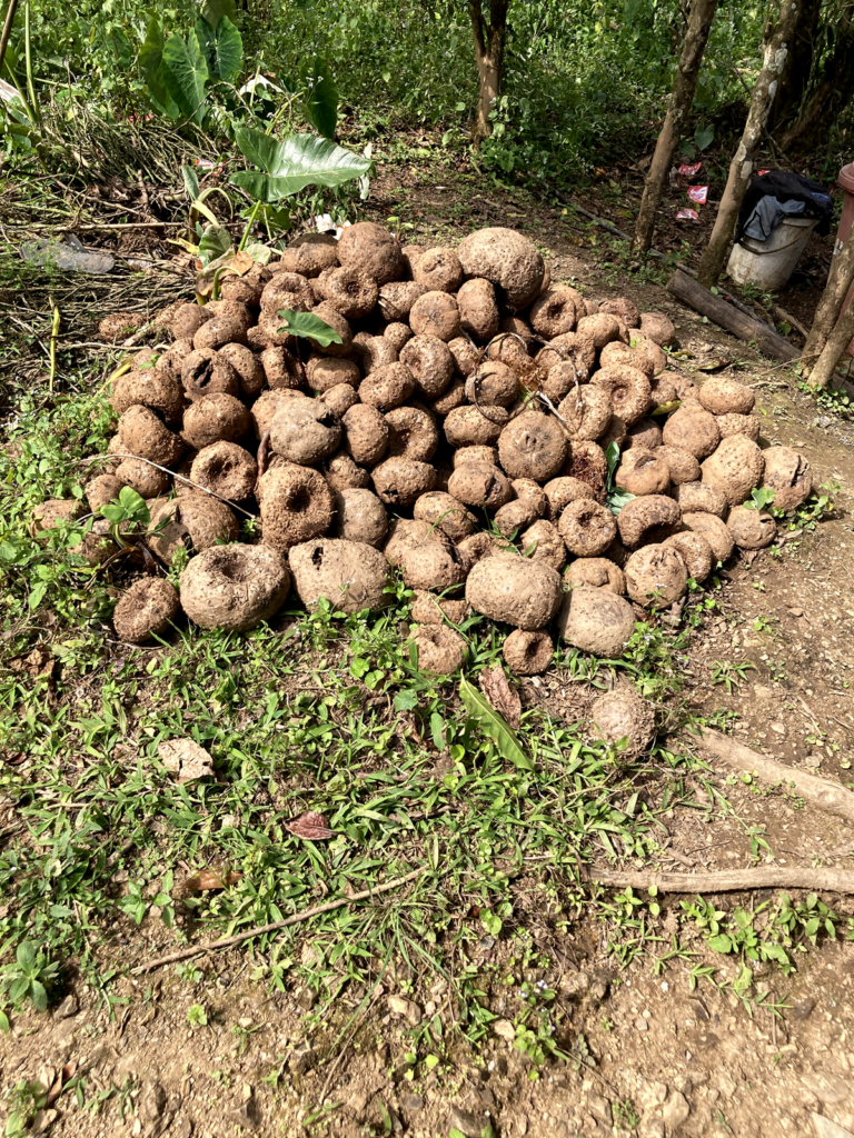 生産者の村では、コンニャクイモを発見。東ティモールの人たちは食べませんが、輸出用で需要があるそうです。年に一度しか収穫できないコーヒー。コーヒーの収穫がない端境期には外に働きに出てしまう人も多く、自分たちの地域で育てられるものを増やすなど、収入の多角化が課題です。「コンニャクイモ、日本でも輸入しないか」との声も。